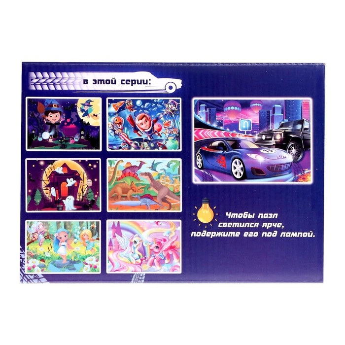 Cветящийся пазл «Крутые тачки» — это занимательная развивающая игра в новом формате. Достаточно выключить свет в комнате, и вы увидите, как собранная картинка благодаря особой краске начнёт светиться в темноте.