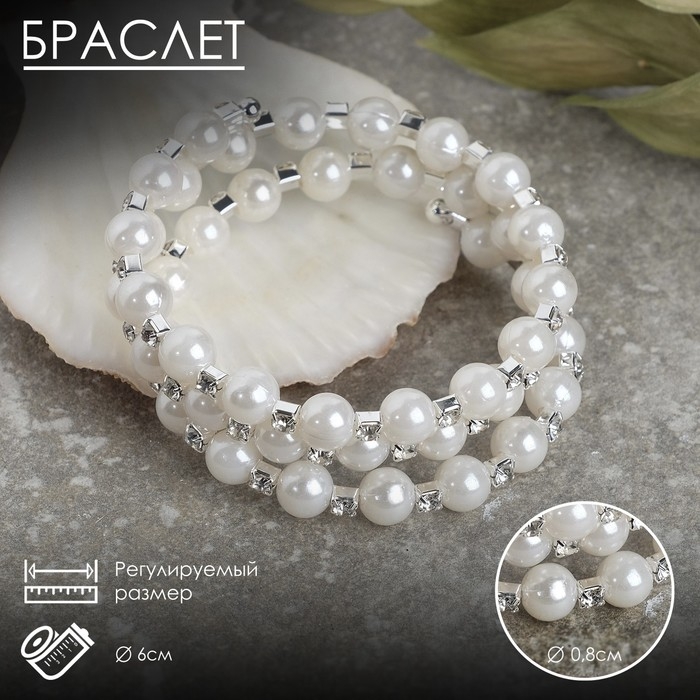 Браслет жемчуг «Пружинка» стразинки, шар № 6, цвет белый в серебре, L=6 см