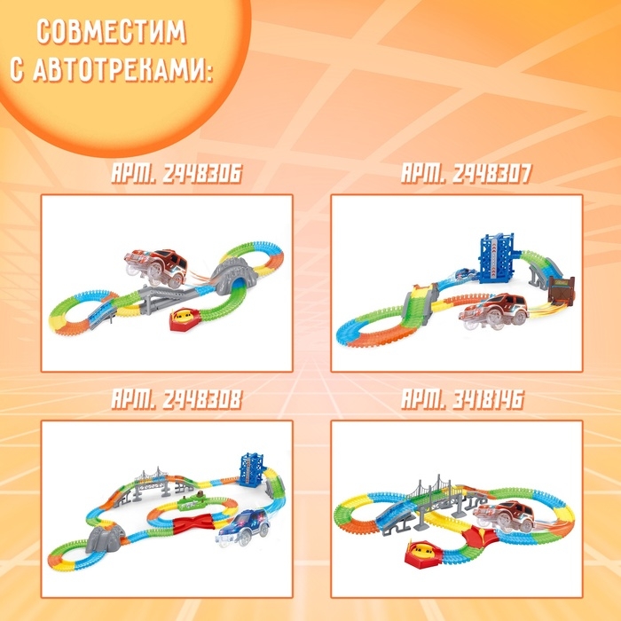 Пришло время эффектных световых шоу — скоростных заездов на гибком треке! Постройте крутую трассу с мостами, спусками, подъемами и мёртвыми петлями и запускайте по ней эту машинку! Ни один юный гонщик не останется равнодушным!
