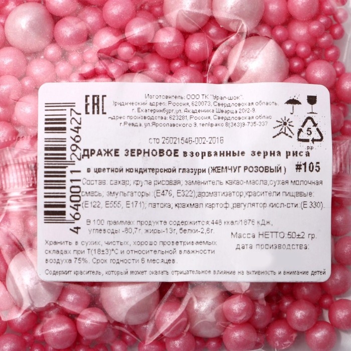 Кондитерская посыпка с мягким центром "Жемчуг", розовая, 50 г