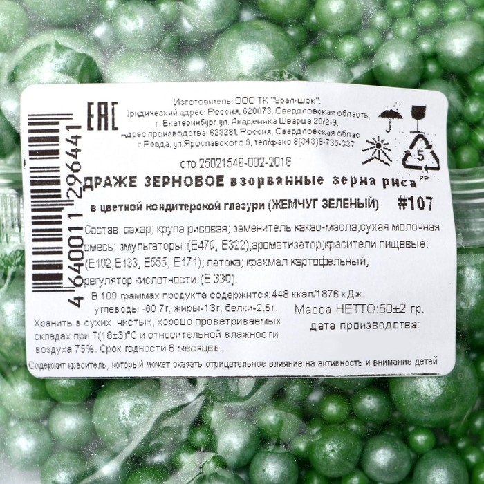 Посыпка кондитерская "Жемчуг", взорванные зерна риса, зеленый, 50 г