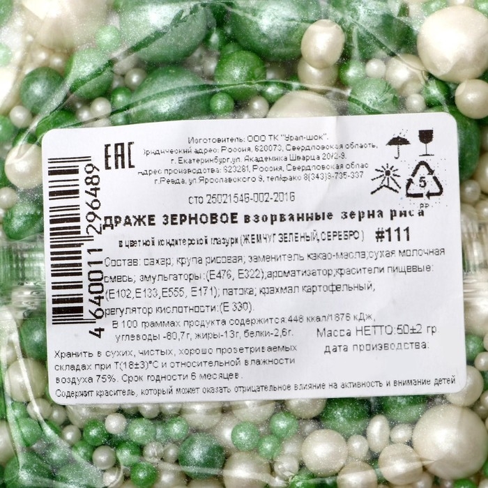 Посыпка кондитерская "Жемчуг", бело-зеленый микс, 50 г