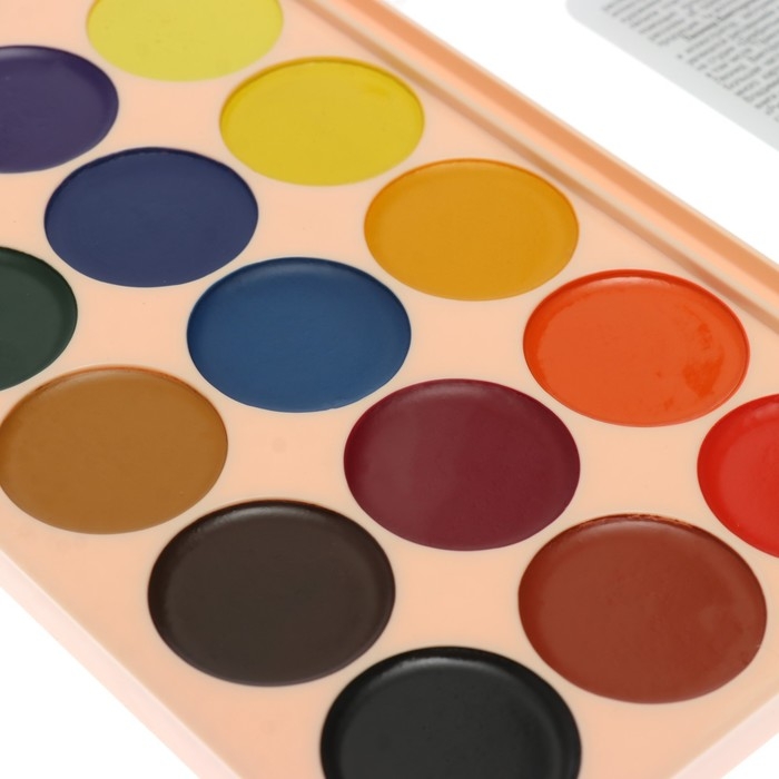 Медовая акварель изготовленная по классической рецептуре с яркими и чистыми цветами. Краска в подложке расположена группами: холодные-тёплые оттенки. Прекрасно размывается и разносится по поверхности бумаги, имея прозрачную основу без вкраплений. Краски смешиваются между собой, сохраняя насыщенность цвета. Краска легко смывается с рук и одежды.
