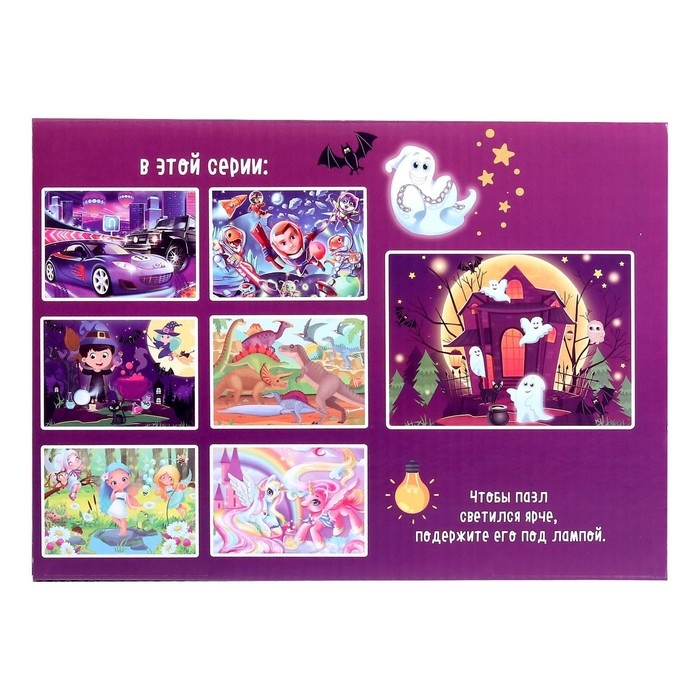 Это не просто пазл, а волшебная игра-головоломка! Достаточно выключить свет в комнате, и вы увидите, как собранная картинка благодаря особой краске начнёт светиться в темноте.