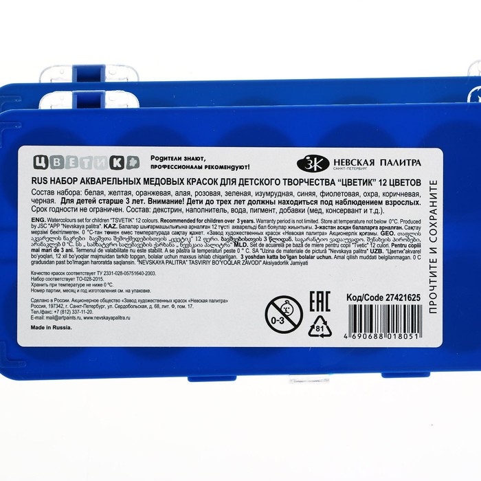 Акварельные медовые краски разрабатывались с учетом высоких требований к качеству и безопасности. Краски легко берутся на кисть, смешиваются и разносятся по бумаге. Рисунок остается ярким даже после высыхания. Краски безопасны при попадании на кожу ребенка, легко отстирываются и смываются с любых поверхностей.