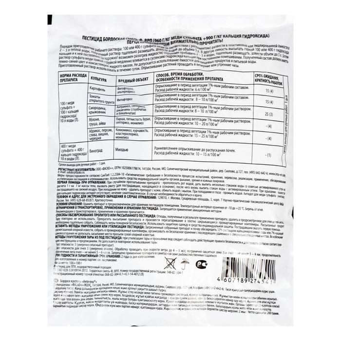 Бордоская смесь - используется для приготовления бордоской жидкости, которая в свою очередь применяется для борьбы с заболеваниями (фитофтороз, коккомикоз, ржавчина, парша, курчавость и т.д.) на различных растениях. В виноградарстве бордосская жидкость применяется в борьбе с милдью,антракнозом, черной гнилью, краснухой, церкоспорозом, меланозом и др.