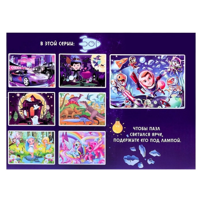 Перед вами не просто пазл, а волшебная игра-головоломка! Достаточно выключить свет в комнате, и вы увидите, как собранная картинка, благодаря особой краске, начнёт светиться в темноте.