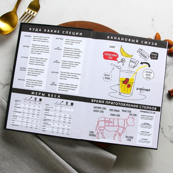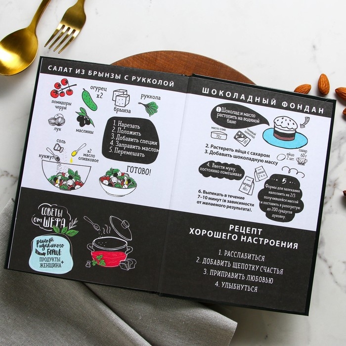 Ежедневник для записи рецептов - Отличный помощник на кухне, он всегда будет под рукой, в отличие от любых электронных аналогов. Записи позволят не забыть про удачный рецепт, который снова захотите повторить. Для удобства использования, вы можете отмечать сложность, время приготовления, где готовится и количество порций, для каждого рецепта, а так же записывать весь процесс приготовления. Благодаря твердой обложке он прослужит долгие годы. А универсальный формат, не займет много места на вашей кухне.