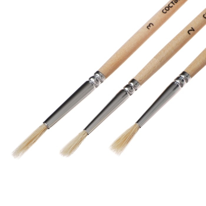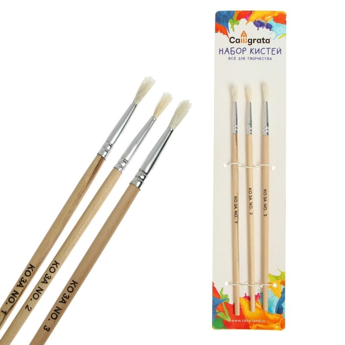 Набор кистей коза, 3 штуки (№1, 2, 3), круглые, с деревянными ручками, в блистере
