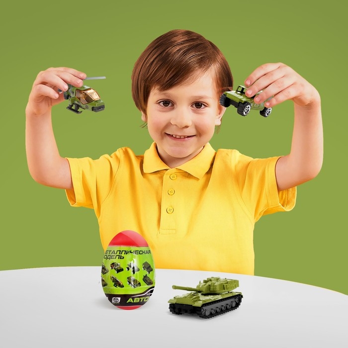 Представьте удивление ребёнка, когда он откроет яйцо и найдёт внутри не просто машинку, а настоящий сюрприз — металлическую машинку «Военная»! С ней ребёнок погрузится в мир военных приключений, возьмёт на себя роль командира и защитит свою базу от нападения противника!