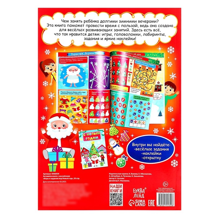 Внутри малыш найдёт игры, головоломки, лабиринты, задания и более 120 ярких наклеек. А также сможет украсить открытку любыми стикерами из набора, которые ему понравятся.