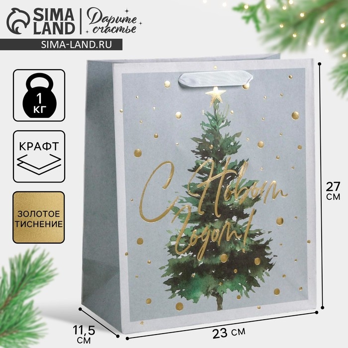 Пакет подарочный новогодний крафтовый вертикальный «Сказочная ёлочка», ML 23 х 27 х 11.5 см, Новый год