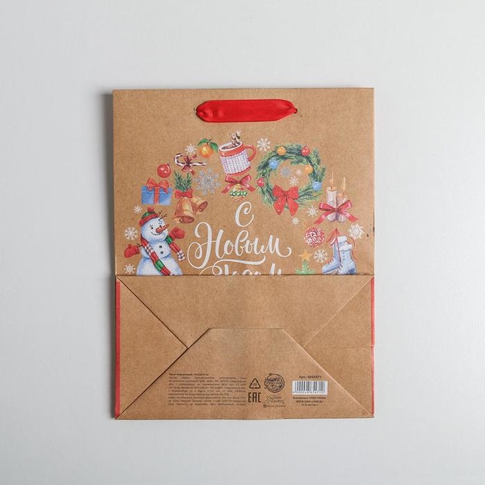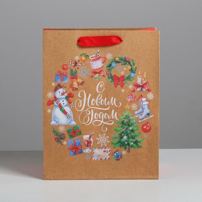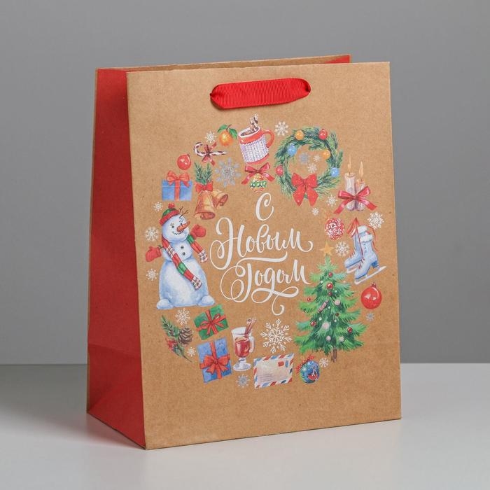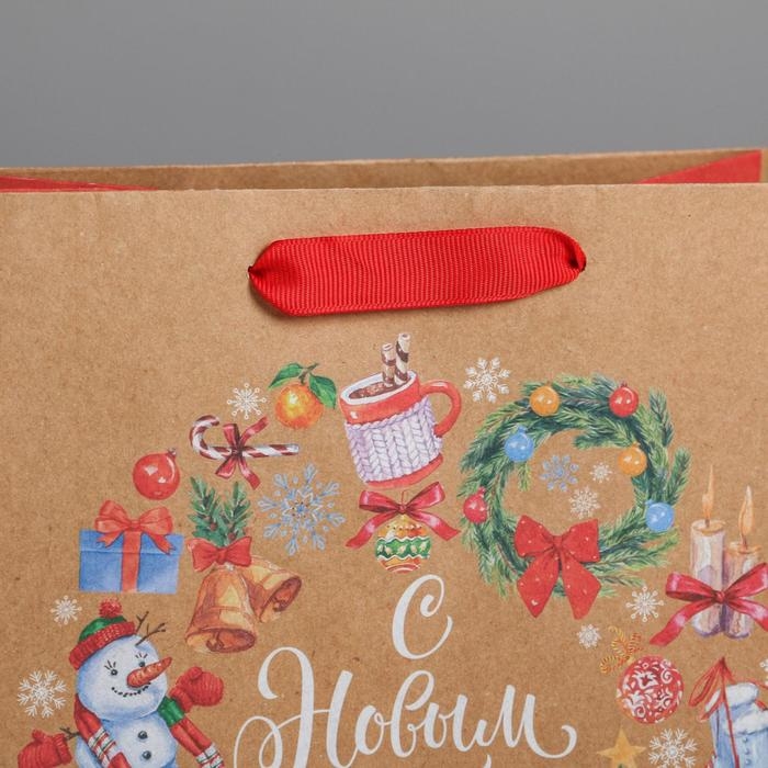 Пакет подарочный новогодний крафтовый вертикальный «Венок», MS 18 х 23 х 10 см, Новый год