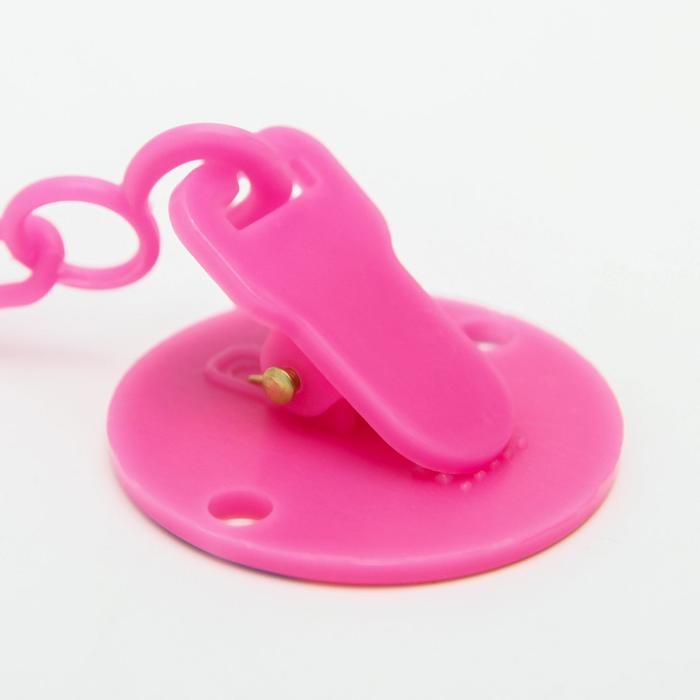 Изделие фиксируется на одежде ребёнка. На конце цепочки есть карабин, который зацепляется за кольцо пустышки. Надёжное крепление убережёт вещь от падения на пол, если малютка случайно выронит её изо рта.