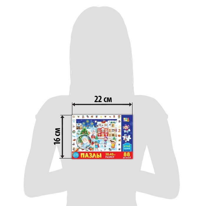 Собирайте фрагменты в одно целое, находите персонажей и предметы, а также обсуждайте с ребёнком то, что происходит на изображении. В этом вам поможет лупа из безопасного пластика - её вы найдёте в коробке.