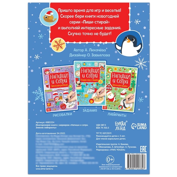 Многоразовая книга с маркером «Напиши и сотри. Зимние лабиринты», 12 стр.