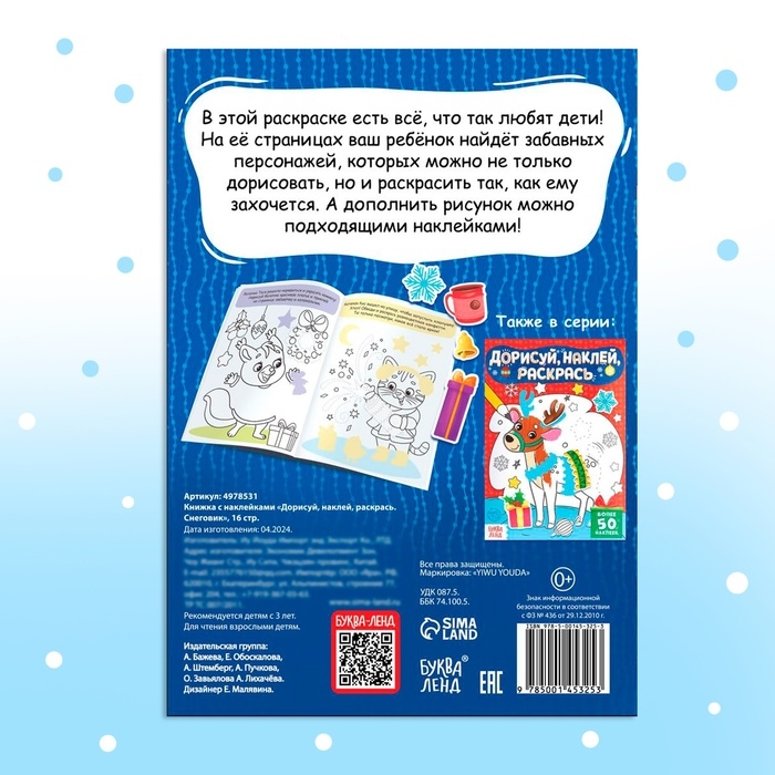Книжка с наклейками «Дорисуй, наклей, раскрась. Снеговик», 16 стр., формат А5