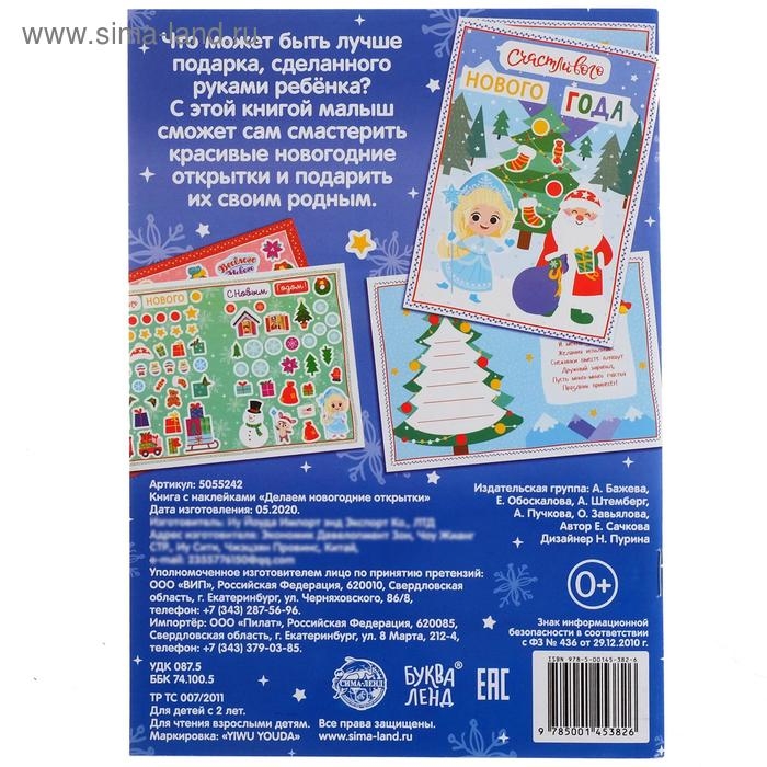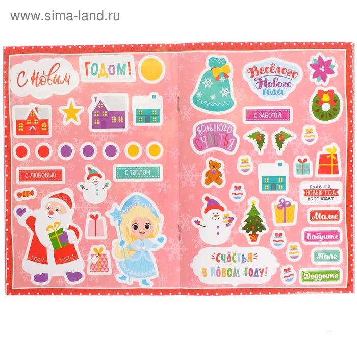 Книжка с наклейками «Делаем новогодние открытки» поможет скоротать время в ожидании праздника и смастерить оригинальные открытки для близких. Этот комплект отлично подходит для развития мелкой моторики и фантазии ребёнка.