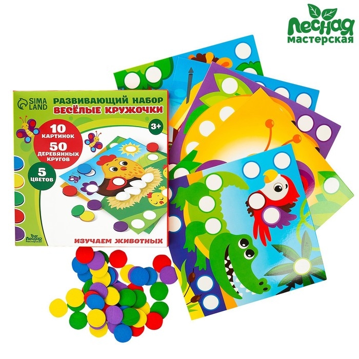 Развивающий набор "Весёлые кружочки. Изучаем животных" - 10 ярких картинок, 50 деревянных кругов, 5 основных цветов для игры и обучения!