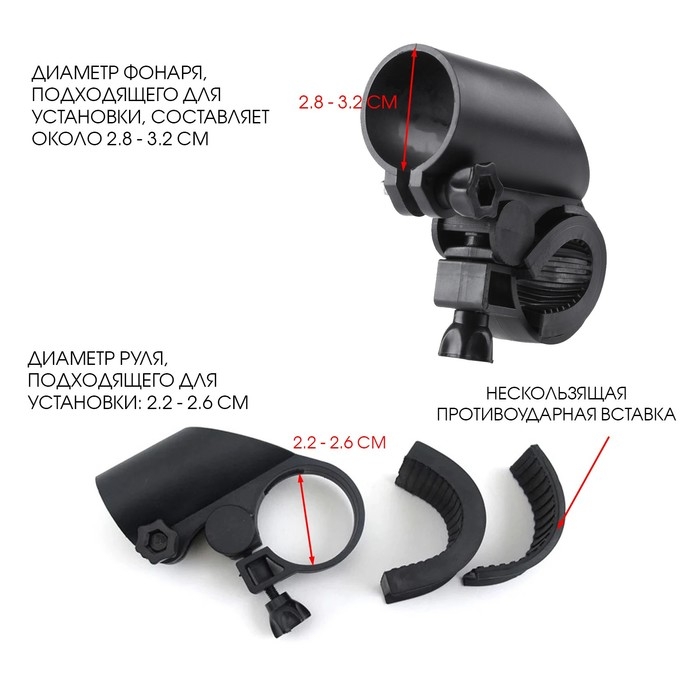 Размер зажима регулируется, позволяя точно подогнать крепление под корпус велосипедного фонарика. Крепление устанавливается на руль через отверстие сбоку и фиксируется винтом.