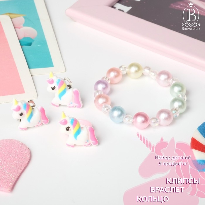 Набор детский «Выбражулька» 3 предмета: клипсы, браслет, кольцо, единороги, цветной