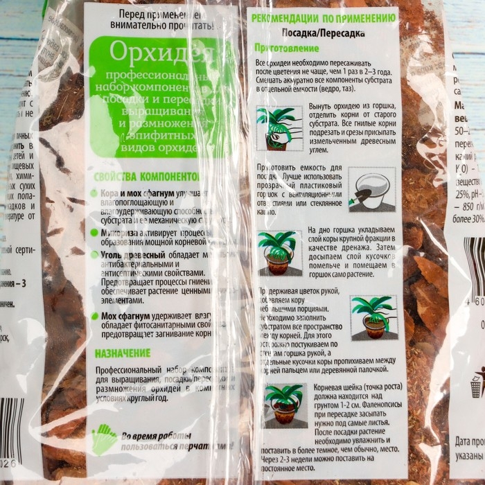 Состав: кора сосновая обработанная, мох сфагнум, микориза-активатор роста корней, древесный уголь.