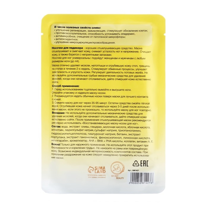 Отшелушивающая маска-носки для ног на основе экстракта оливы, универсальные, 1 пара