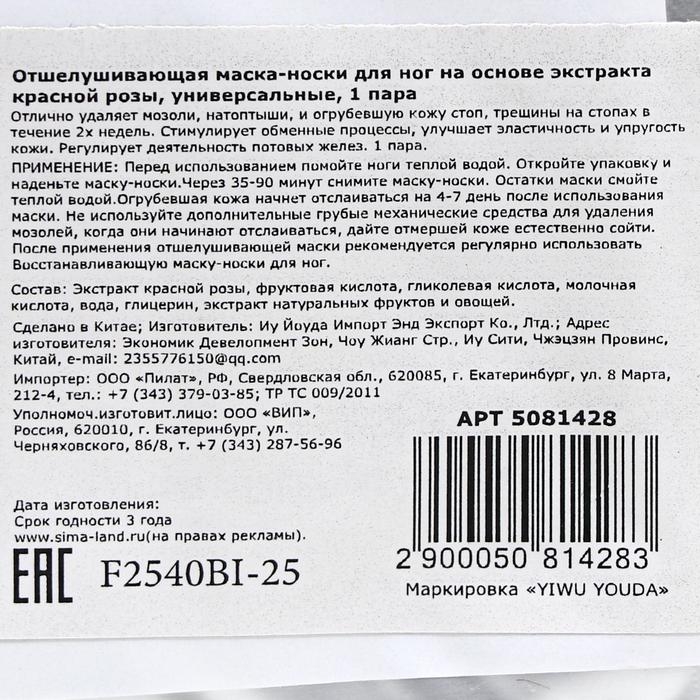 Отшелушивающая маска-носки для ног на основе экстракта красной розы, универсальные, 1 пара