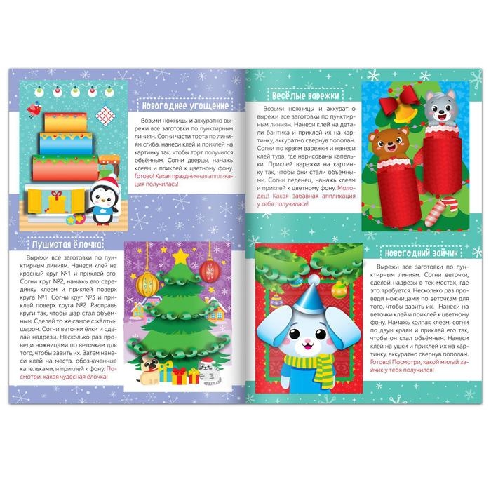 В этой книге ребёнка ждут объёмные аппликации. Его задача: вырезать фигурки из бумаги и приклеить их на основу. В итоге получится 4 готовых картинки.