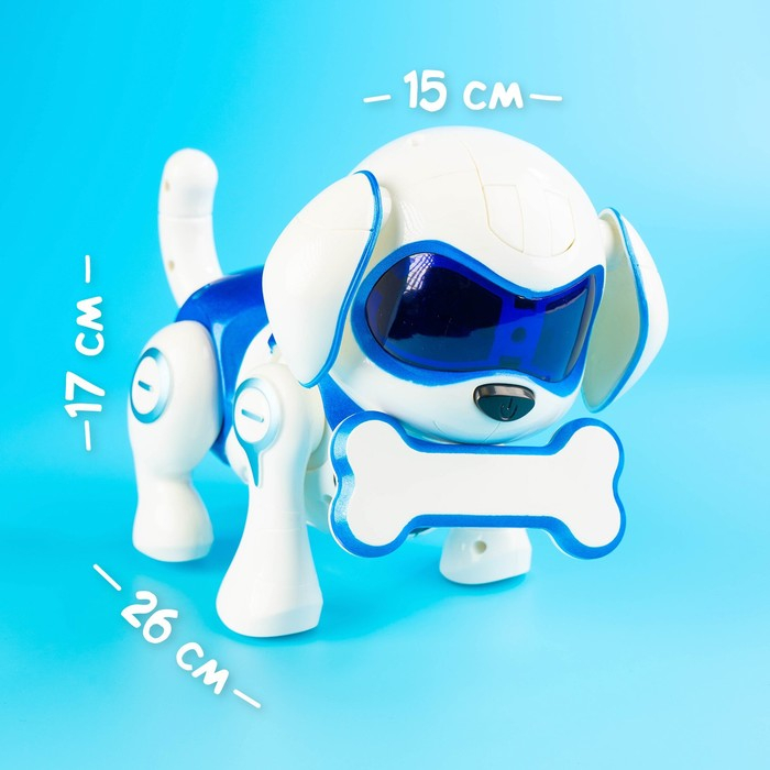 Робот собака Charlie IQ BOT, на пульте управления, интерактивный: звук, свет, танцующий, музыкальный, на батарейках, на русском языке, бело-голубой