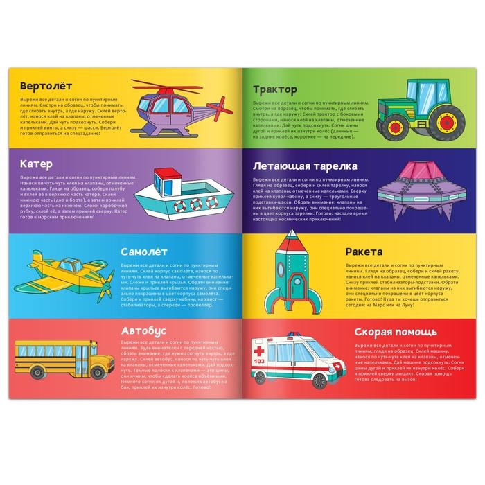 В ней ребёнок найдёт целых 8 моделек транспорта, которые нужно собрать из бумаги. Малышу предстоит вырезать детали и склеить их между собой.