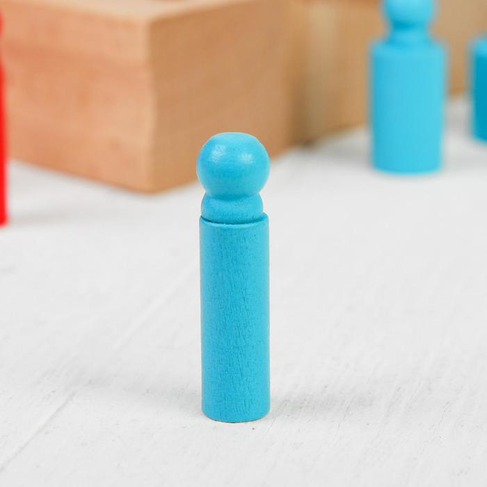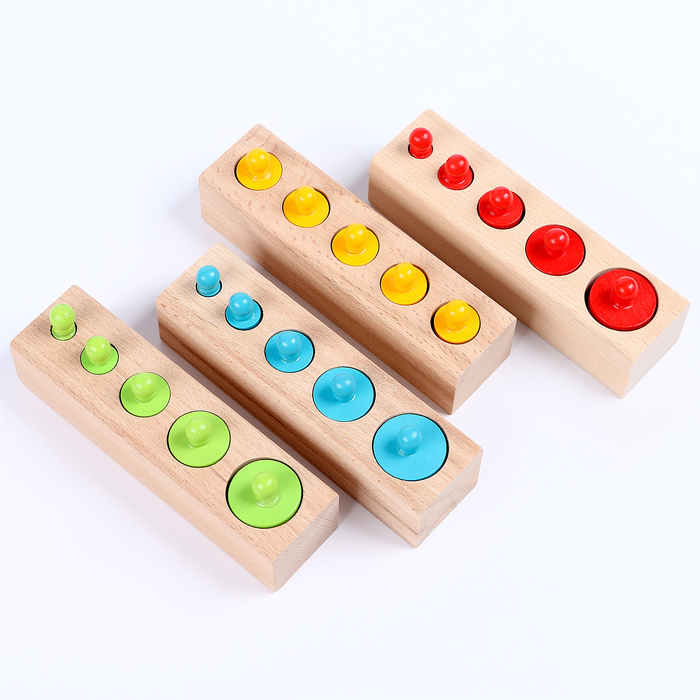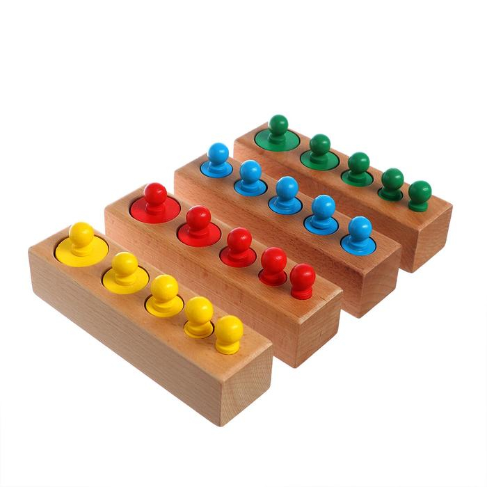 Набор состоит из четырёх деревянных блоков с разноцветными цилиндрами различных размеров.