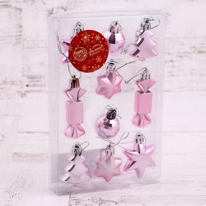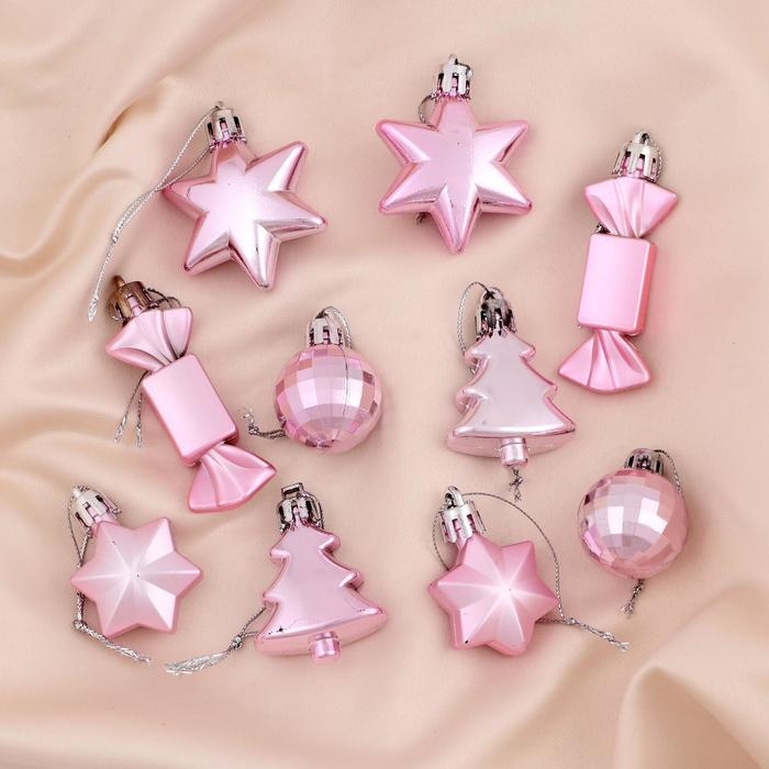 Набор украшений пластик 10 шт "Сюрприз" (4 звезды, 2 конфеты, 2 ёлки, 2 шара-4 см) розовый