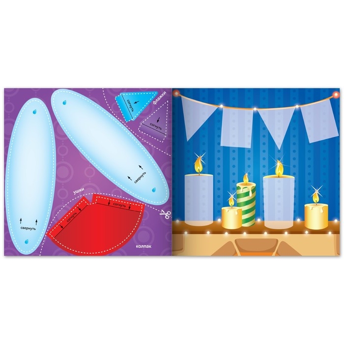 Малыш будет вырезать детали, предложенные в книге, и использовать клей. Ребёнок научится создавать новогодние поделки.