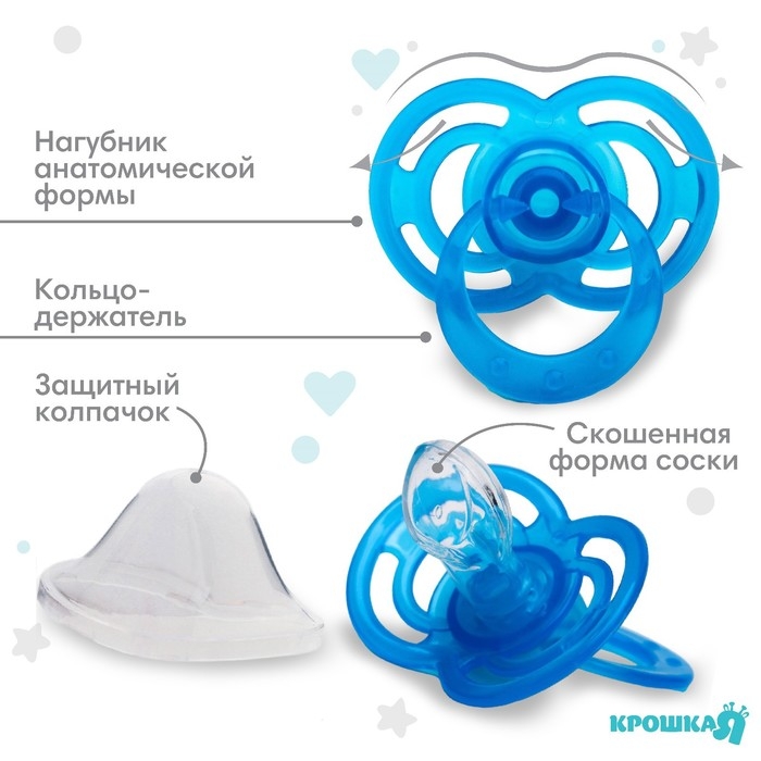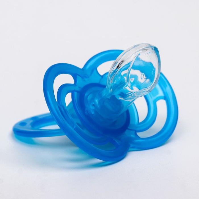 Соска пустышки силиконовая и имеет анатомическую форму диска, специальные вентиляционные отверстия на пустышке улучшают циркуляцию воздуха не раздражают кожу малыша и не оставляют следов и опрелостей. Создана для удовлетворения естественного сосательного рефлекса малышей. Пустышка анатомической формы имеет немного сплюснутый сосок, благодаря чему прилегает к языку.