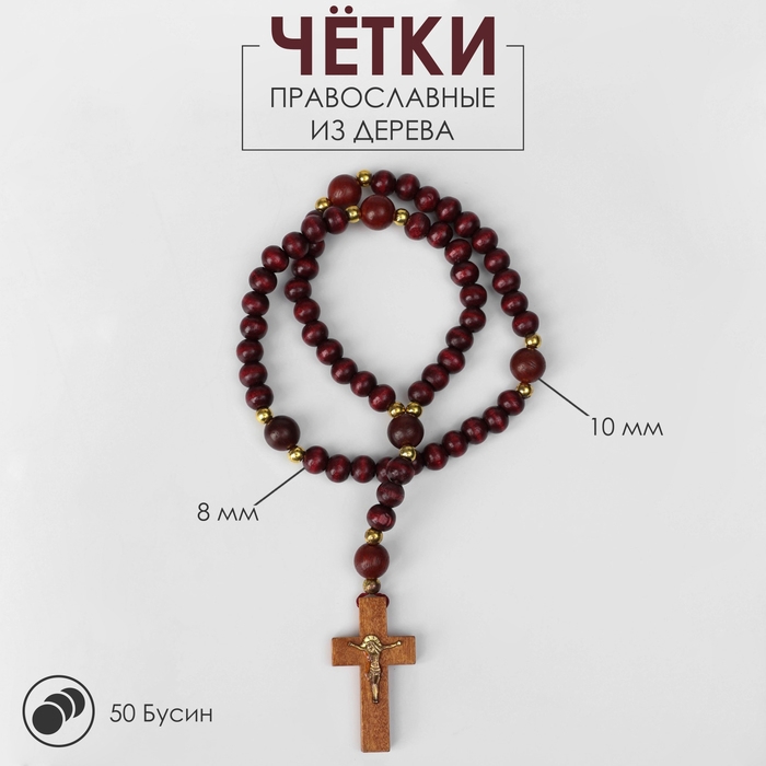 Чётки деревянные «Православные» 50 бусин через шарик, с крестиком, цвет коричневый