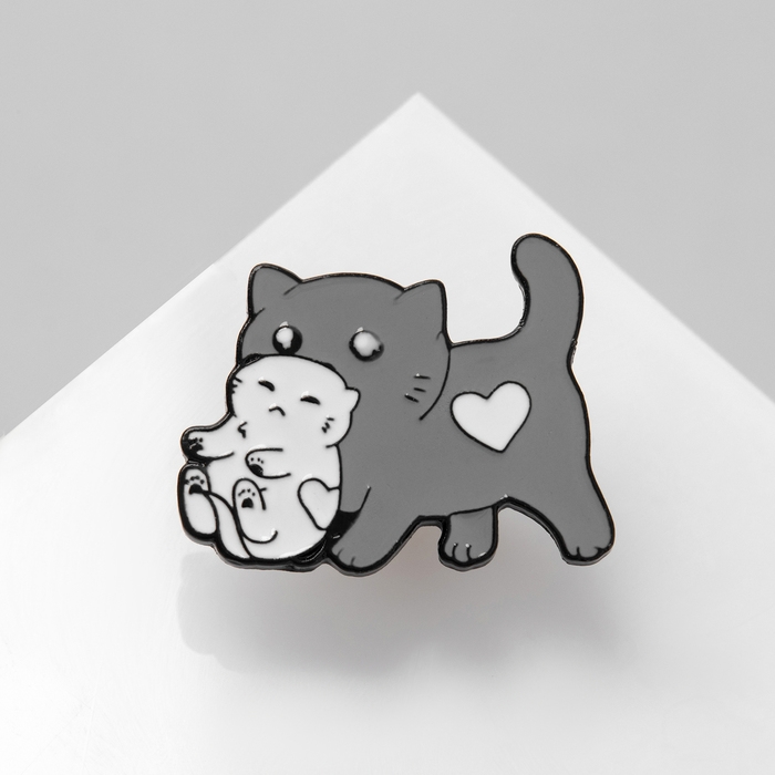 Значок «Кошка с котёнком», цвет серо-белый в чёрном металле