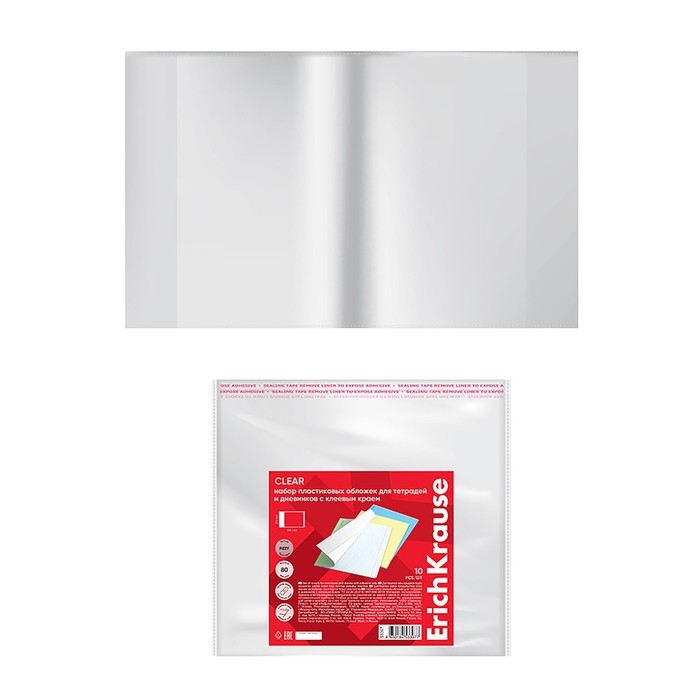 Набор обложек ПП 10 шт, 212 х 395 мм, 80 мкм, ErichKrause "Fizzy Clear", для тетрадей и дневников, с клеевым краем, с тиснением, универсальная