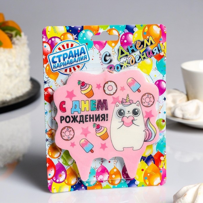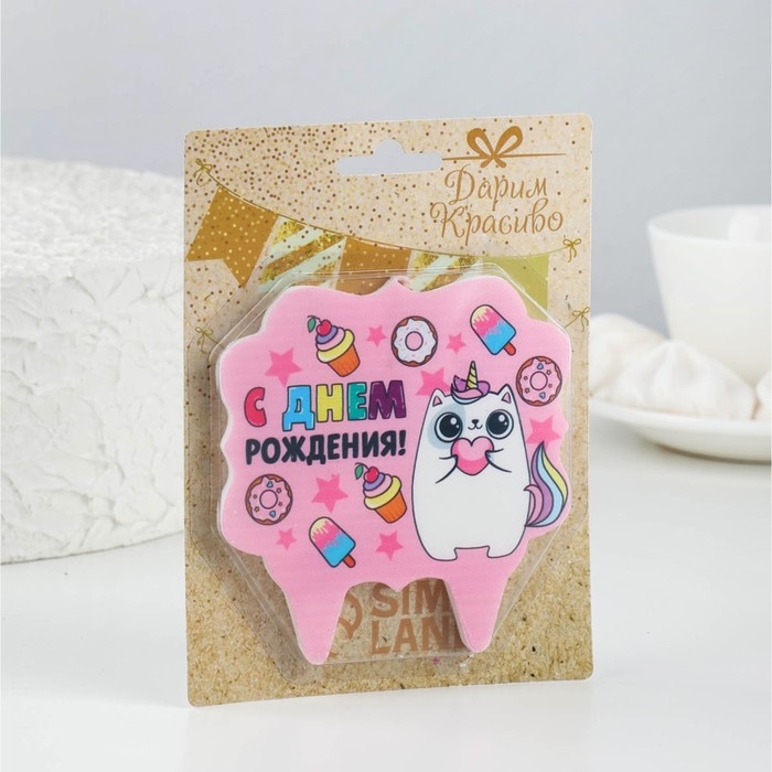 Свеча для торта «С Днём Рождения, котёнок единорожка», 8 см