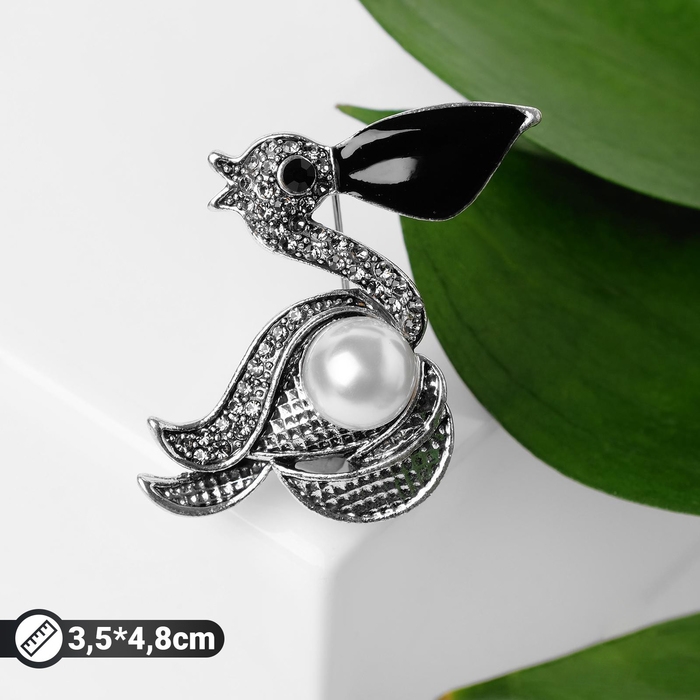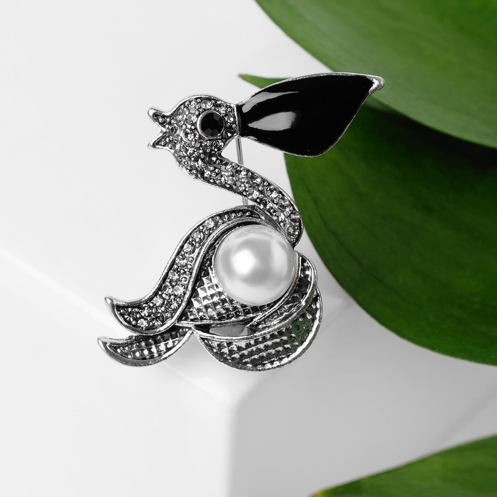 Брошь «Пеликан» с жемчужиной, цвет чёрно-белый в чернёном серебре