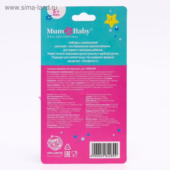 Изделие для прикорма (ниблер) пригодится в период, когда ребёнок переходит с кашки и молока на твёрдую пищу. Приспособление разовьёт у крохи жевательные навыки. Также предмет будет безопасно массировать дёсны во время прорезывания зубов.