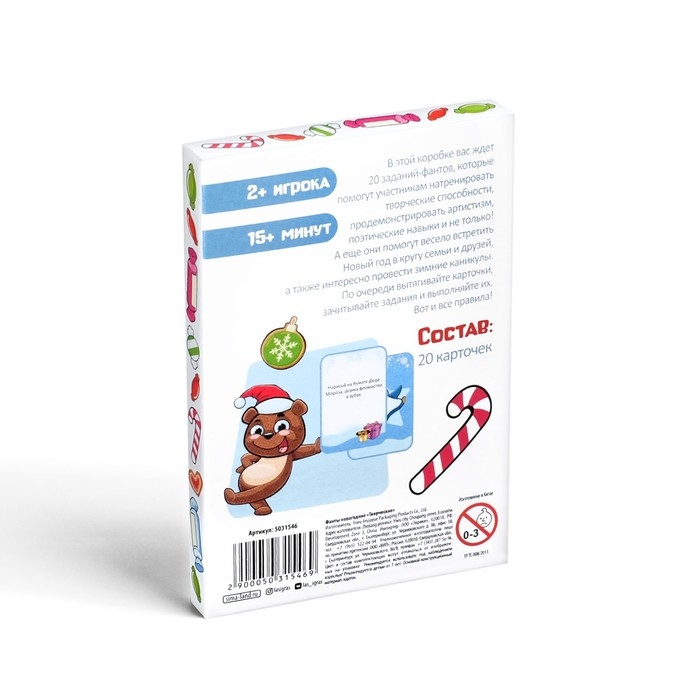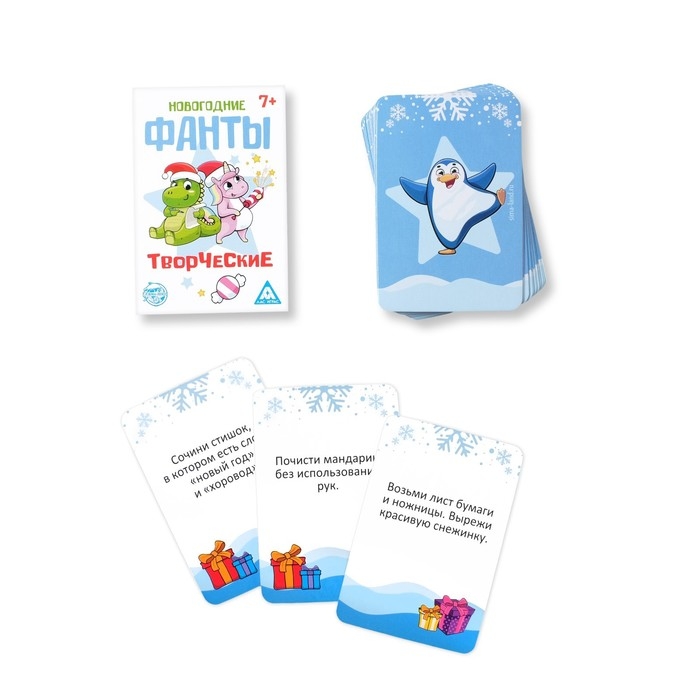 В этой коробке вас ждёт 20 заданий-фантов, которые помогут участникам натренировать творческие способности, продемонстрировать артистизм, поэтические навыки и не только! А ещё они помогут весело встретить Новый год в кругу семьи и друзей, а также интересно провести зимние каникулы.