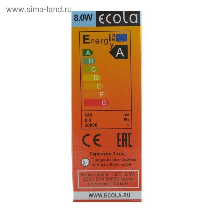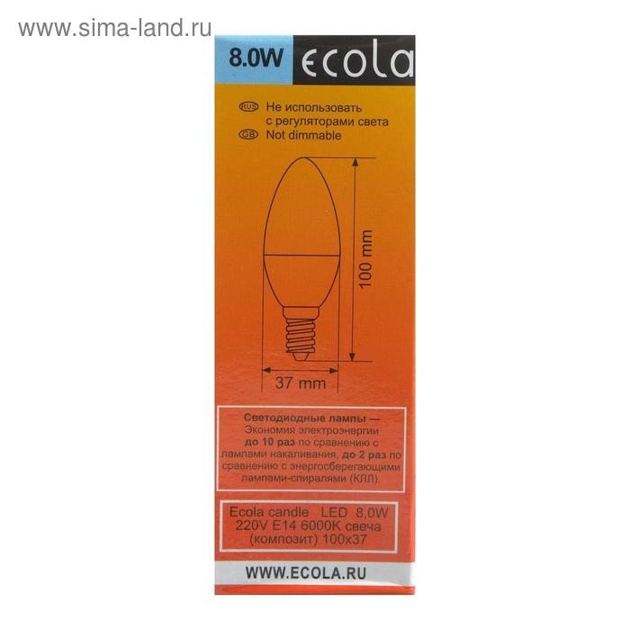 Лампа светодиодная Ecola "свеча", Е14, 8 Вт, 6000 К, 220 В, 103х37 мм
