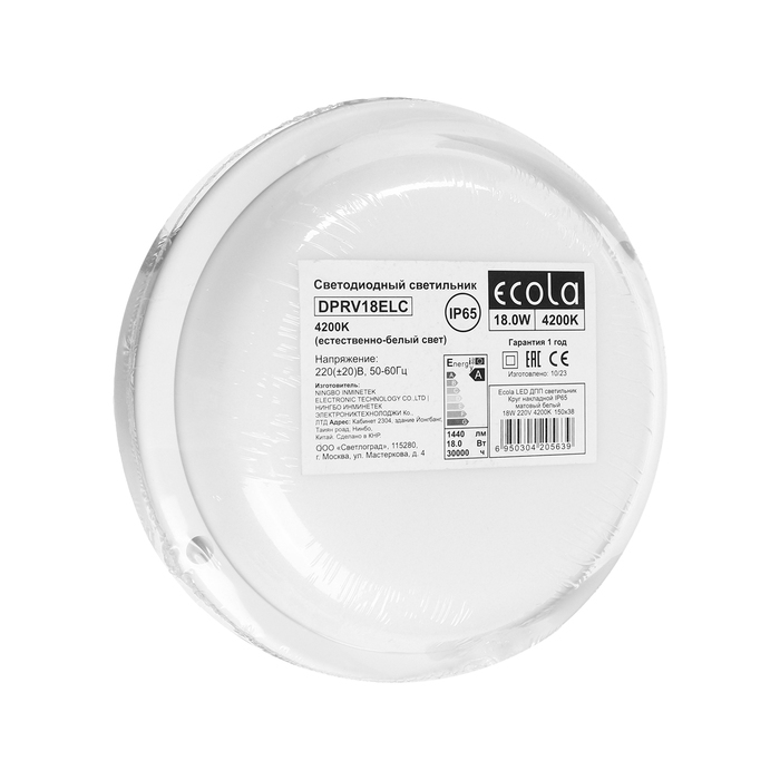 Светильник светодиодный Ecola, 18Вт, 4200К, 220В, IP65, 150х38мм, круглый, накладной, белый