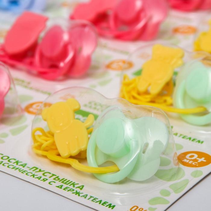 Соска - пустышка силиконовая классическая, от 0 мес., с держателем, цвет МИКС