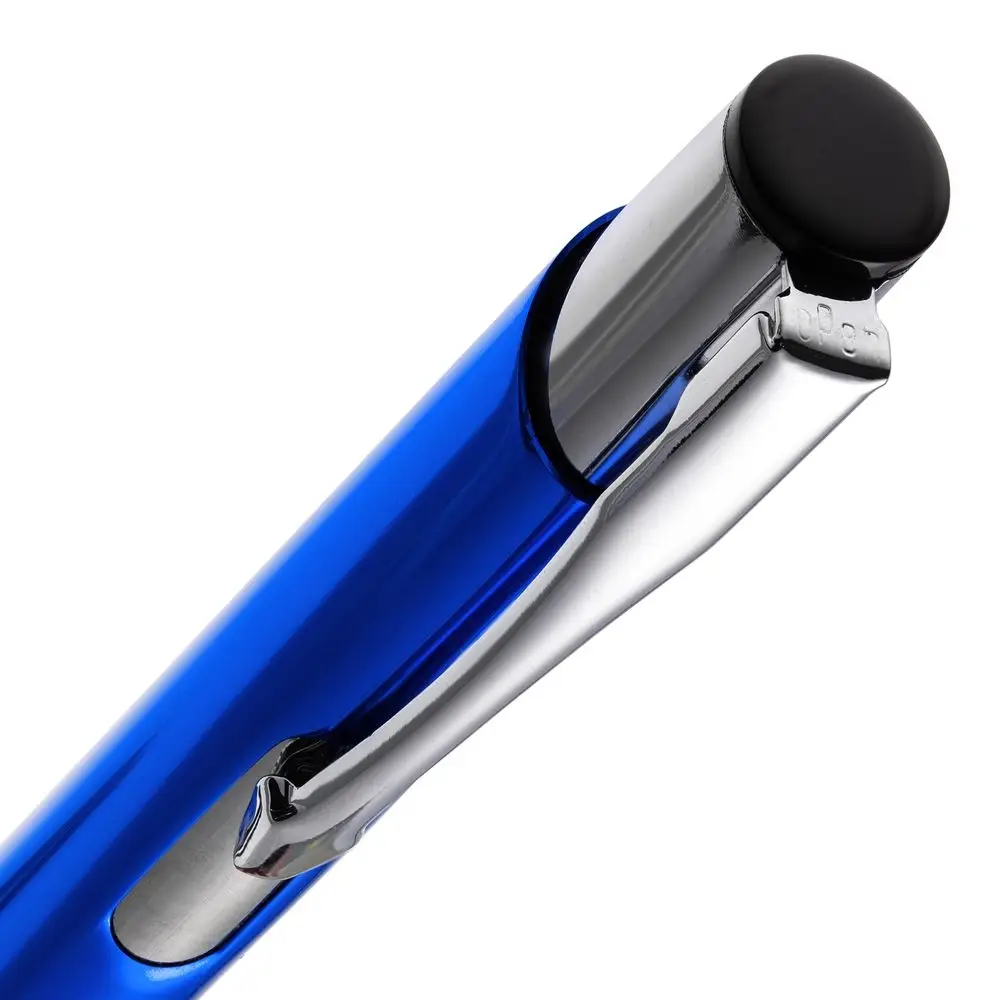 Яркая шариковая ручка с глянцевым цветным корпусом и хромированными деталями.