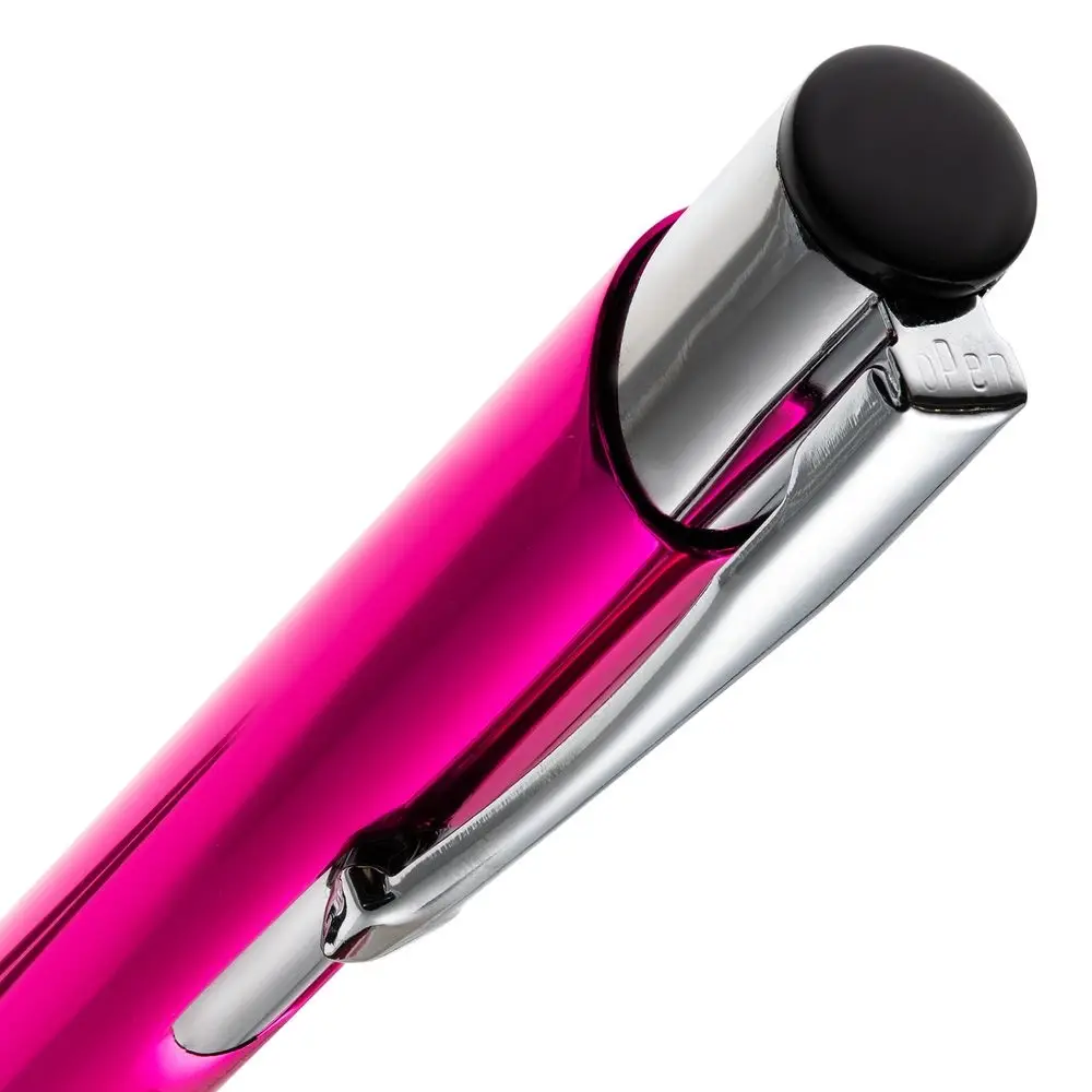 Яркая шариковая ручка с глянцевым цветным корпусом и хромированными деталями.