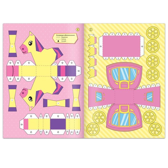 В ней ребёнок найдёт заготовки фигурок пони, кареты, двух принцесс и даже целый дворец, которые нужно собрать своими руками и сделать из бумаги. Малышке предстоит вырезать детали и склеить их между собой.