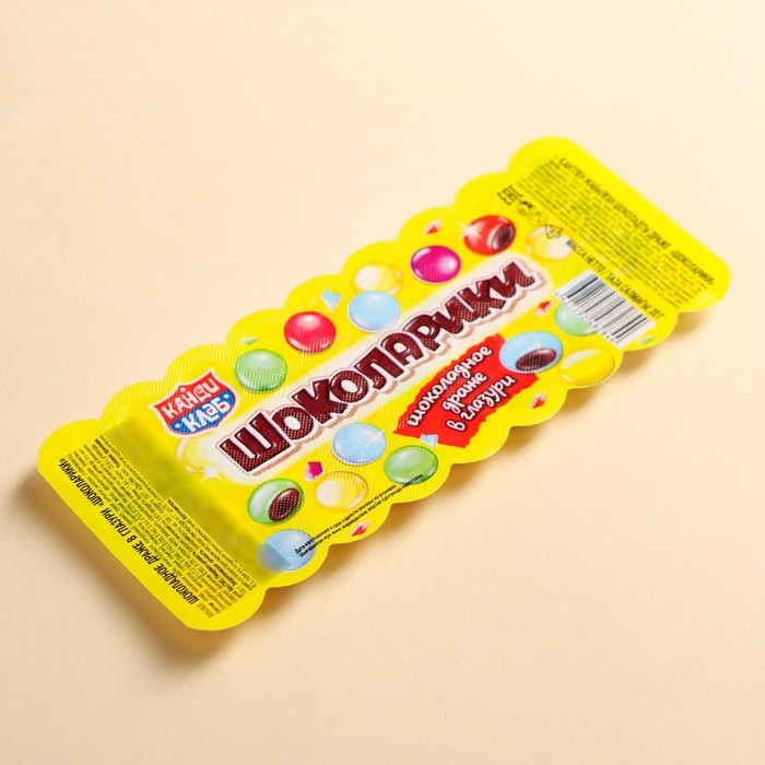 Состав: сахар, пальмовое масло, какао-порошок, кукурузный крахмал, сухое цельное молоко, стабилизатор (гуммиарабик), эмульгатор (соевый лецитин), глазирователь (карнаубский воск), ароматизаторы (ванилин, шоколад), красители (Е171, Е160а, Е150d, Е142, Е133, Е162, Е163, Е102, Е129).