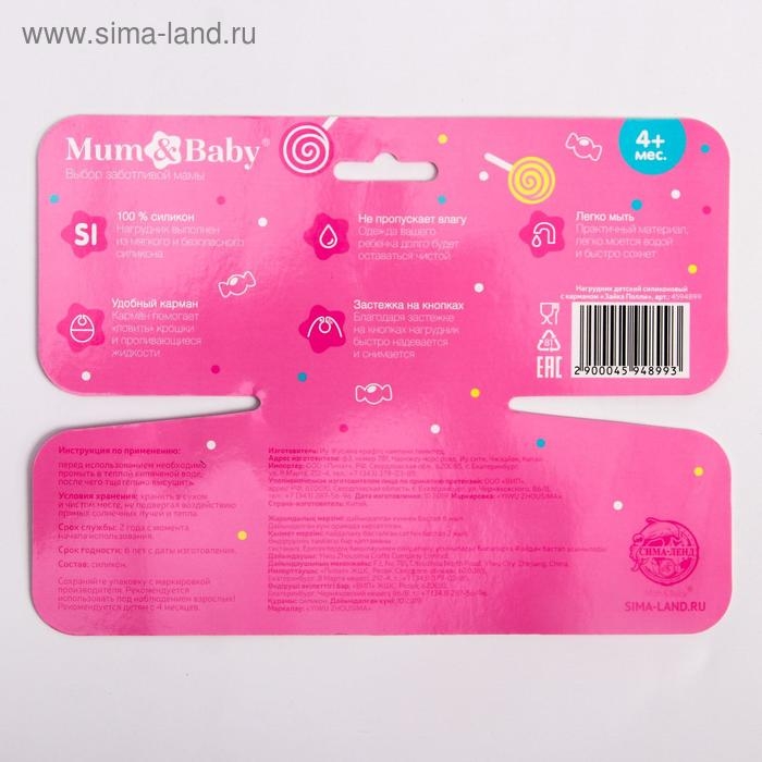 Товар изготовлен из силикона, не содержащего токсичных веществ. После использования мойте тёплой мыльной водой. Нагрудник рекомендован для детей старше 4 месяцев.